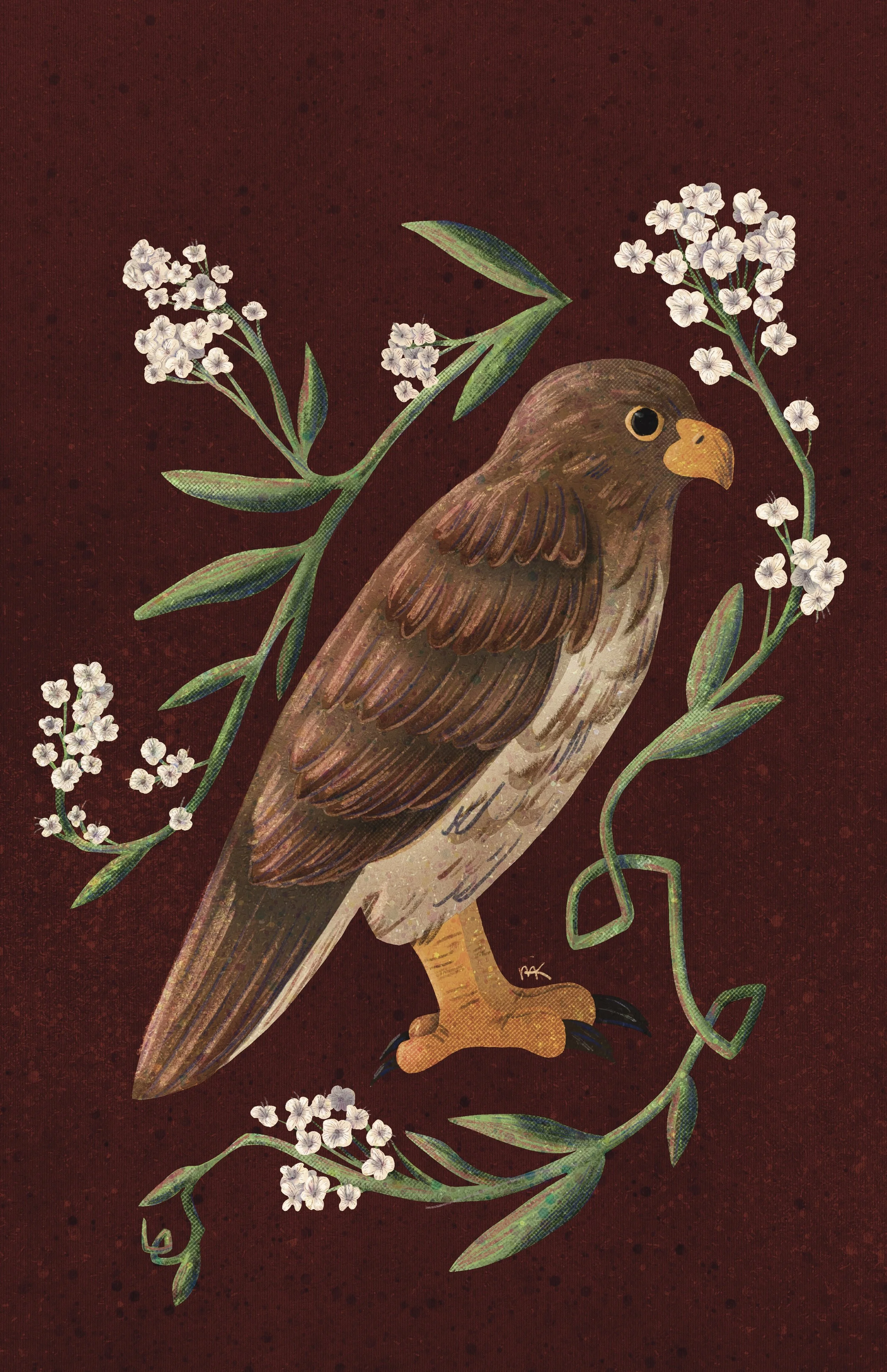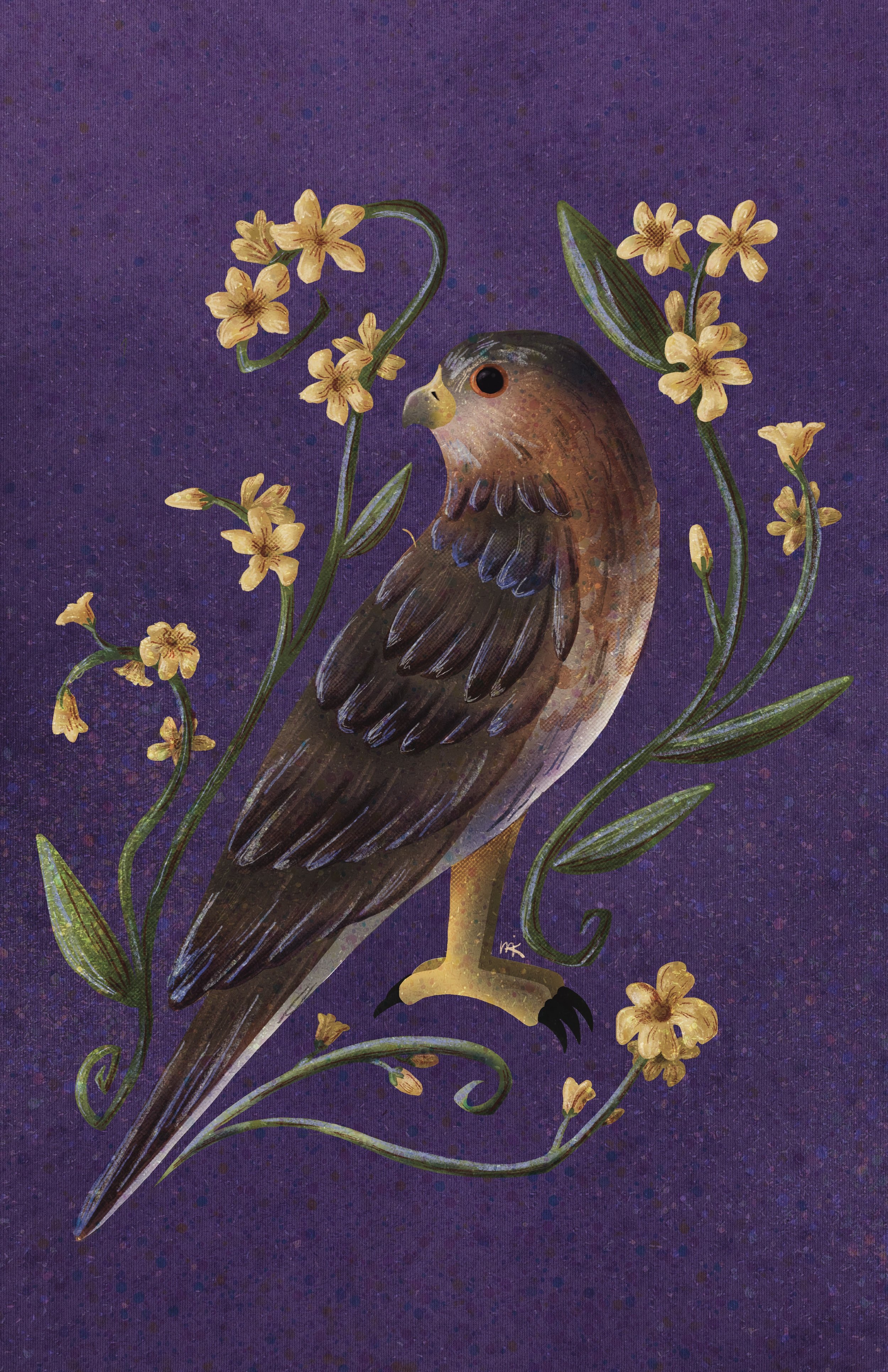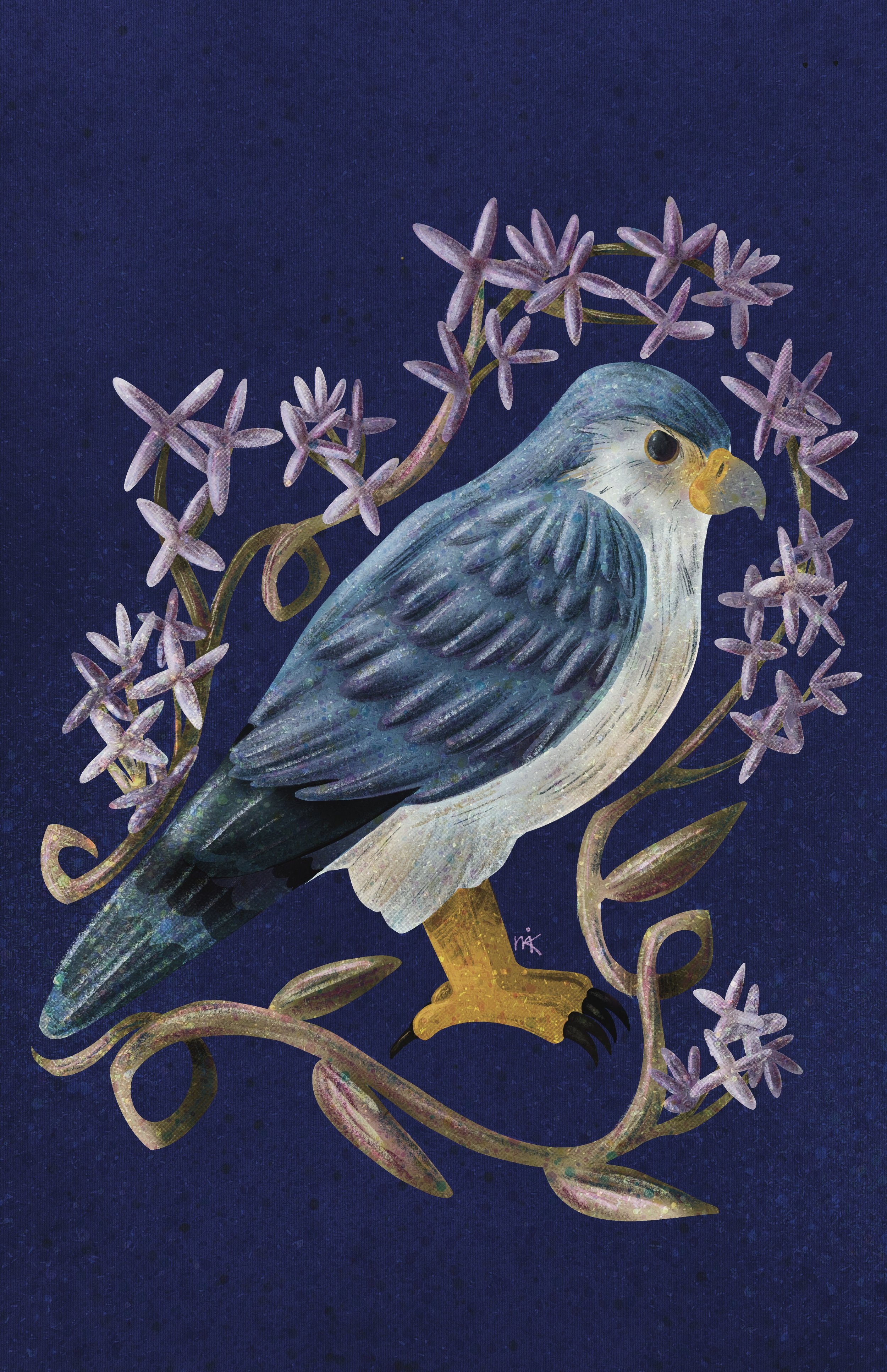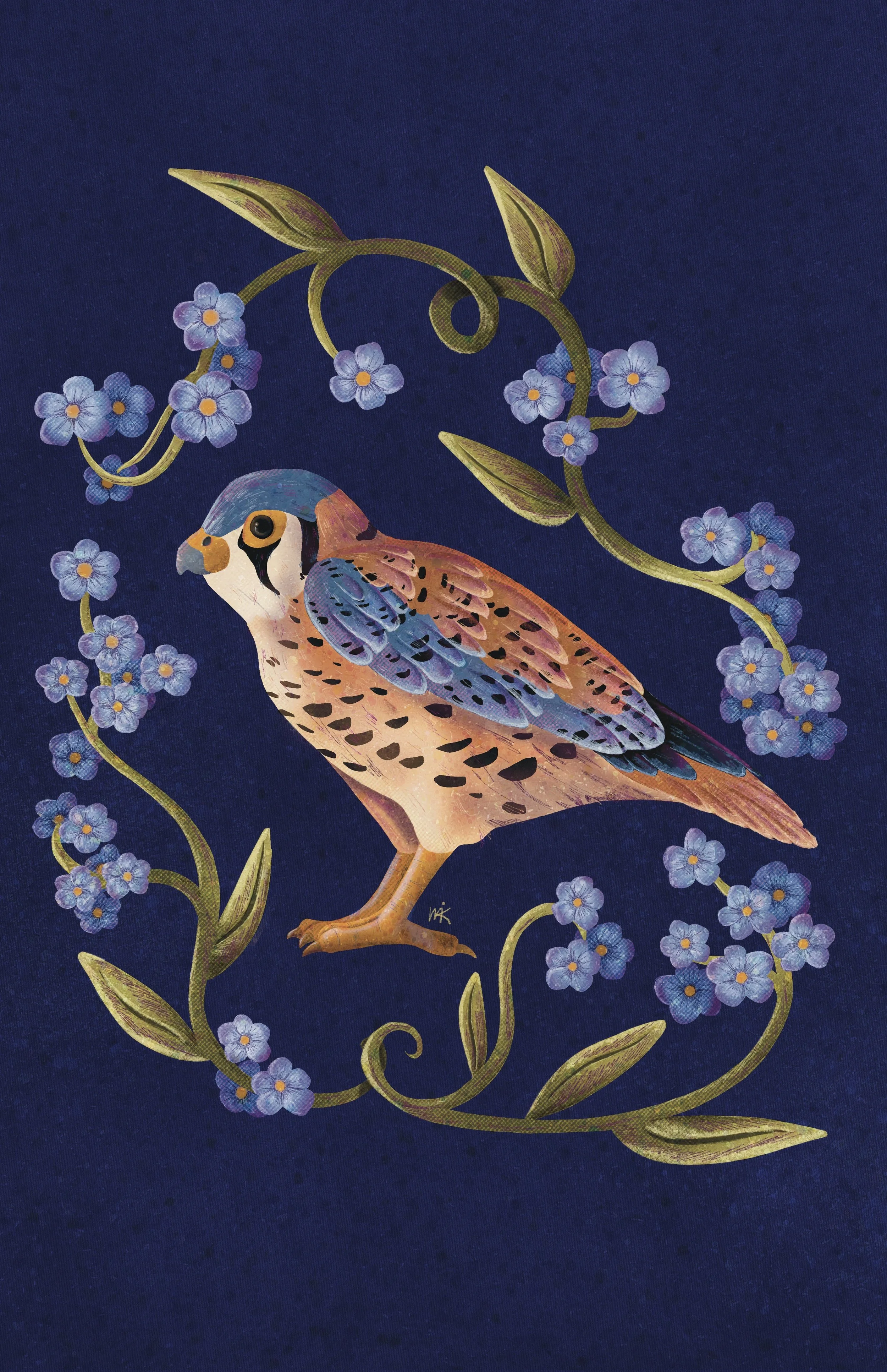 The second illustration created for this series is a male American Kestral surrounded by forget-me-nots. Kestrels are the smallest falcon found in North America!